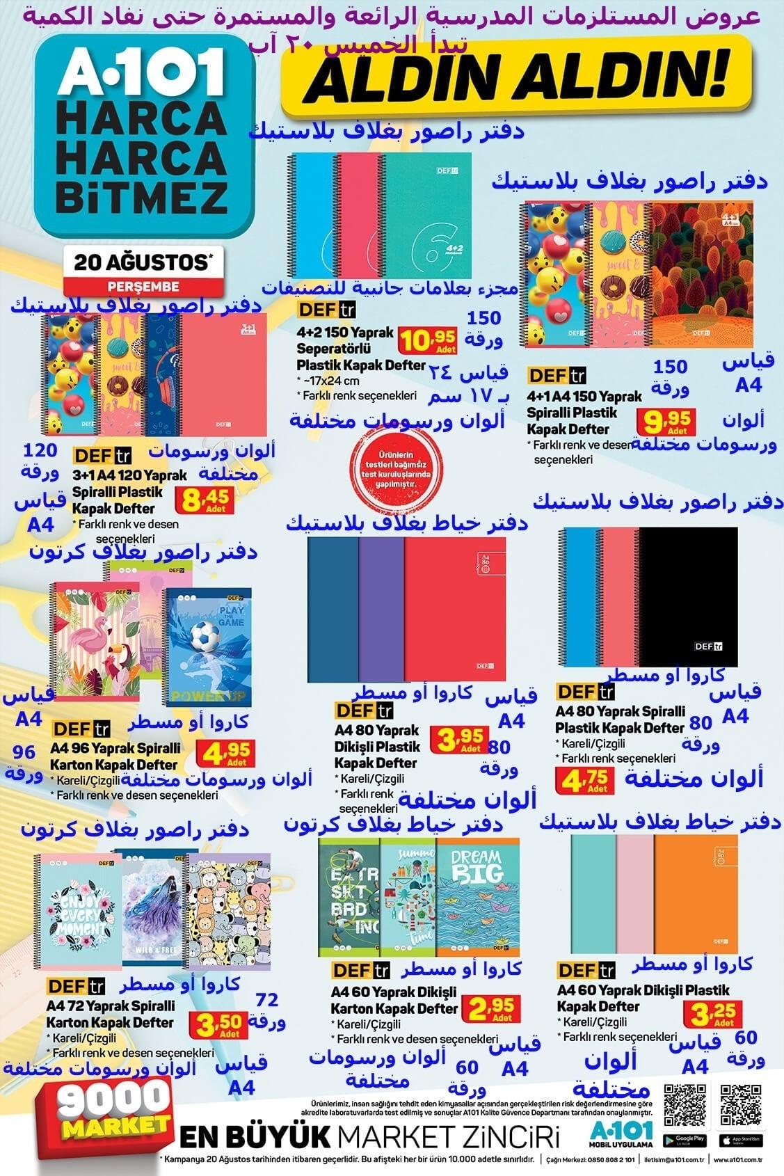 من عروض المستلزمات المدرسية الرائعة عروض على تشكيلة واسعة ورائعة للغاية من الدفاتر والكراسات والقواميس وغيرها تبدأ الخميس 20 آب في الرائع دائماً ماركت اليوزبير a101 .