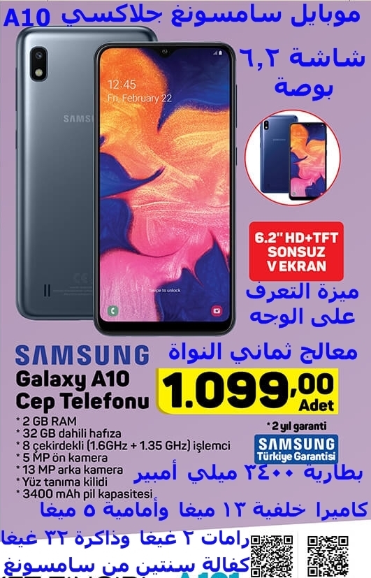 الوصف : موبايل سامسونغ جلاكسي A10 بشاشة 6.2 بوصة ومعالج ثماني النواة وميزة التعرف على الوجه وبطارية 3400 ميلي أمبير وكاميرا خلفية 13 ميغا وأمامية 5 ميغا ورامات 2 غيغا وذاكرة 32 غيغا وبكفالة سنتين من وكالة سامسونغ في تركيا