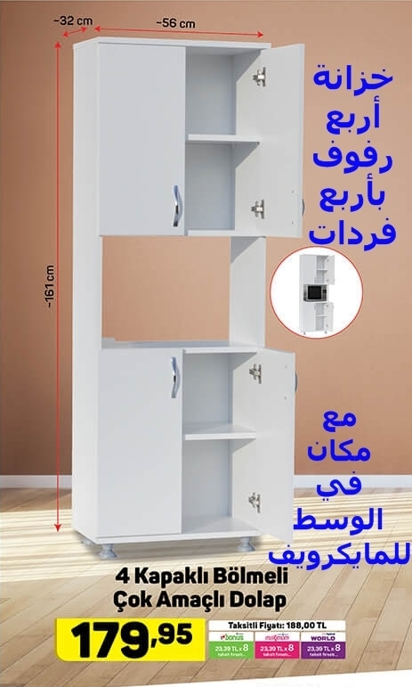 الوصف : خزانة مطبخ من أربع رفوف وأربع فردان مع مكان في الوسط للمايكرويف وبإرتفاع 161 سم وعرض 56 سم وعمق 32 سم