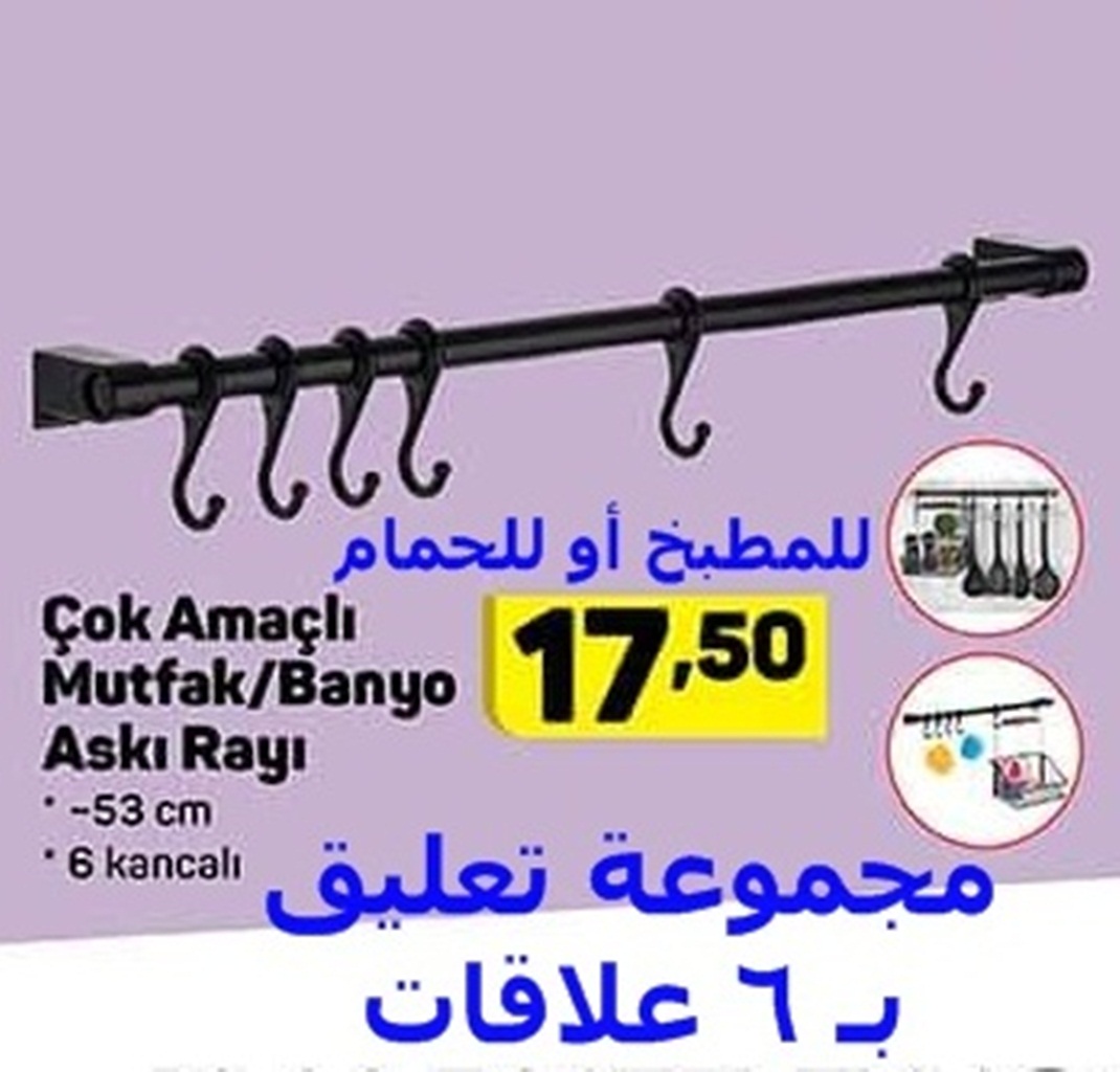 الوصف : عرض مميز على مجموعة تعليق معدنية مع 6 علاقات يمكن إستخدامها في المطبخ أو الحمام وتعليق البشاكير عليها أو معالق السكب أو أشياء أخرى وعرض على سلة معدنية تعليق يمكن أن نضع فيه أدوات التنظيف للمطبخ أو مستلزمات الحمام أو غيرها.