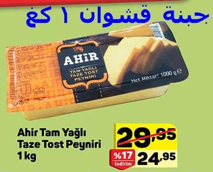 الوصف : عرض مميز على جبنة قشوان 1 كغ من ماركة AHiR بتخفيض 17% عن قيمته الإعتيادية اي تم تخفيض السعر من 29.95 ليرة إلى 24.95 ليرة.