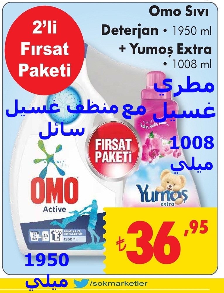 الوصف : منظف غسيل سائل من OMO سعة 1950 ميلي ومطري غسيل من yumoş بفعالية فائقة وبسعة 1008 ميلي كلاهما معاً بسعر 37 ليرة فقط.