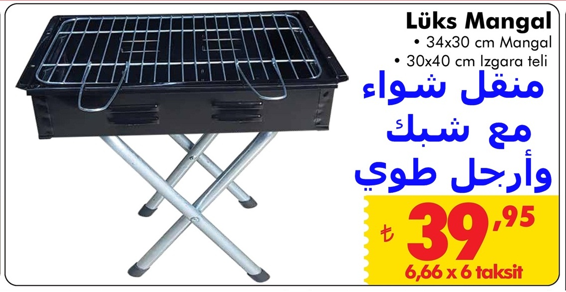 الوصف : عرض مميز على منقل شواء بطول 34 وعرض 30 مع شبك شواء بطول 40 وعرض 30 وبأرجل طوي يساعد طويها على سهولة حملها والتنقل بها وعند الإستخددام يتم فتح الاأرجل للحصول على العلو المناسب للمنقل .